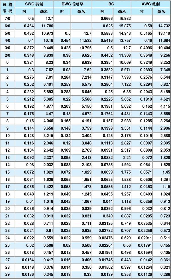 不锈钢彩丝常用规格对照表
